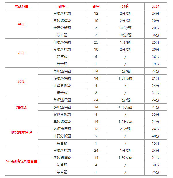 審計(jì)共計(jì)2.5小時(shí);財(cái)務(wù)成本管理共計(jì)2.5小時(shí);經(jīng)濟(jì)法共計(jì)2小時(shí);會(huì)計(jì)共計(jì)3小時(shí);公司戰(zhàn)略與風(fēng)險(xiǎn)管理共計(jì)2小時(shí);稅法共計(jì)2小時(shí)。